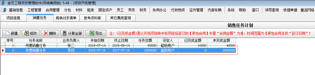 施工項(xiàng)目管理軟件【項(xiàng)目開拓】-【銷售任務(wù)】是用來管理企業(yè)給業(yè)務(wù)員設(shè)定銷售任務(wù)計劃的模塊。