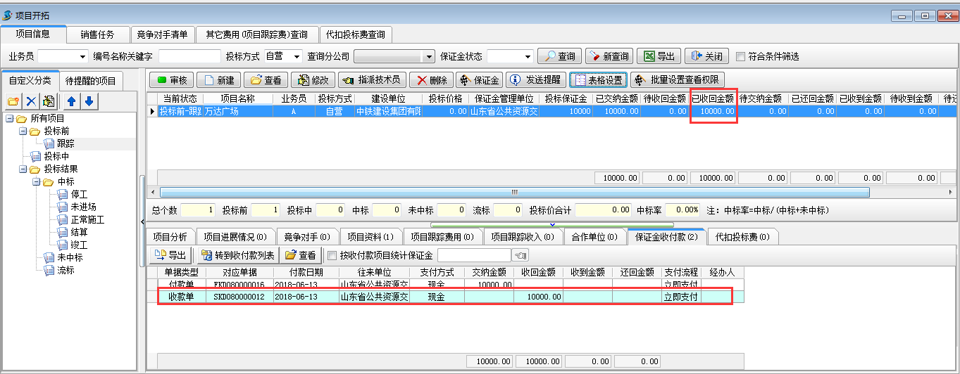 保證金收回,工程管理軟件的項(xiàng)目開拓中會(huì)顯示“已收回金額”為收款金額,待收回金額會(huì)減去已收回金額,“保證金”收付款中會(huì)有對應(yīng)的收款記錄,如圖: