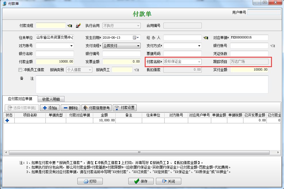 交納投標(biāo)保證金時(shí)填寫“付款申請單”或者“付款單”,(如果填寫的是付款申請單則在付款申請單審核通過之后進(jìn)行付款),如圖: