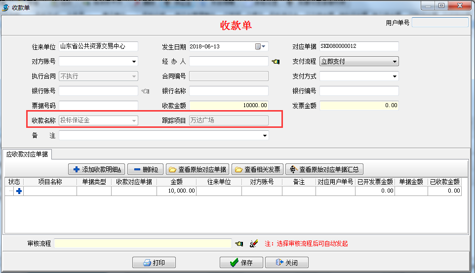 填對應(yīng)收款單,輸入對應(yīng)的收款金額,如圖: