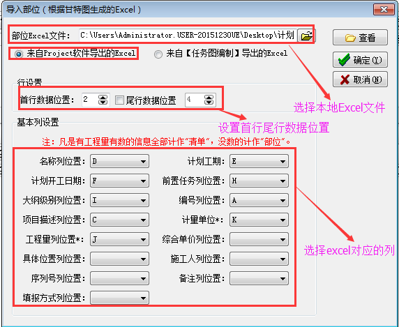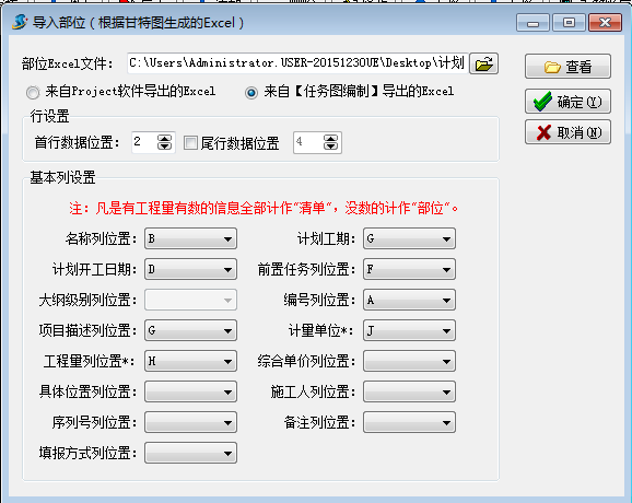 上圖為來自project軟件導(dǎo)出的excel格式。在進(jìn)度管理中導(dǎo)入時(shí)選擇好本地excel文件,設(shè)置好首行尾行數(shù)據(jù)位置,選擇好對應(yīng)excel表中各列位置,即可選擇確定導(dǎo)入,如下圖: