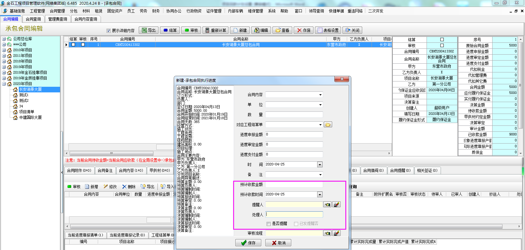 1、在【工程管理】-【承包合同】-合同執(zhí)行進(jìn)度,點(diǎn)擊新增,填寫(xiě)預(yù)計(jì)收款金額、預(yù)計(jì)收款時(shí)間、提醒人、是否提醒。