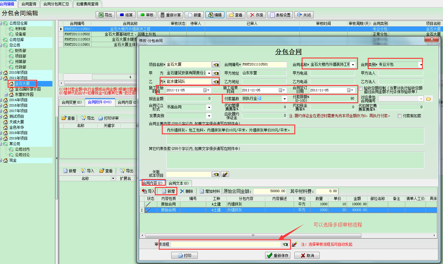 選中[金石大廈]項目點擊【新建】來建立一個合同,界面如下: