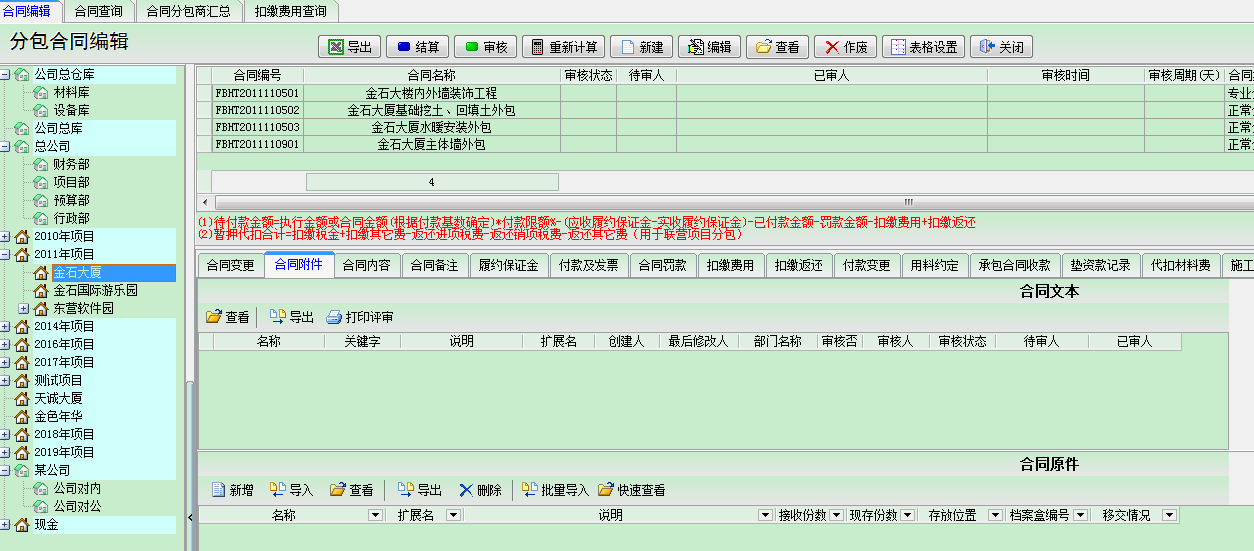 在【合同編輯】中左半部分是合同的分類,分包合同也是按【項目維護】進行分類管理的。一個項目下可以建立多個合同,窗口的右上部分是合同列表,一行信息代表一個合同。右下部位是當前合同相關的內(nèi)容:【合同附件】、【合同內(nèi)容】、【合同備注】、【履約保證金】、【合同提醒】、【合同付款及相關發(fā)票】、【合同罰款】、【扣繳費用】、【合同材料約定】、【資質(zhì)管理】、【合同借閱】。