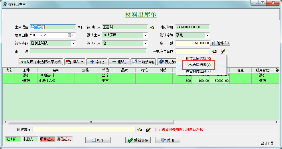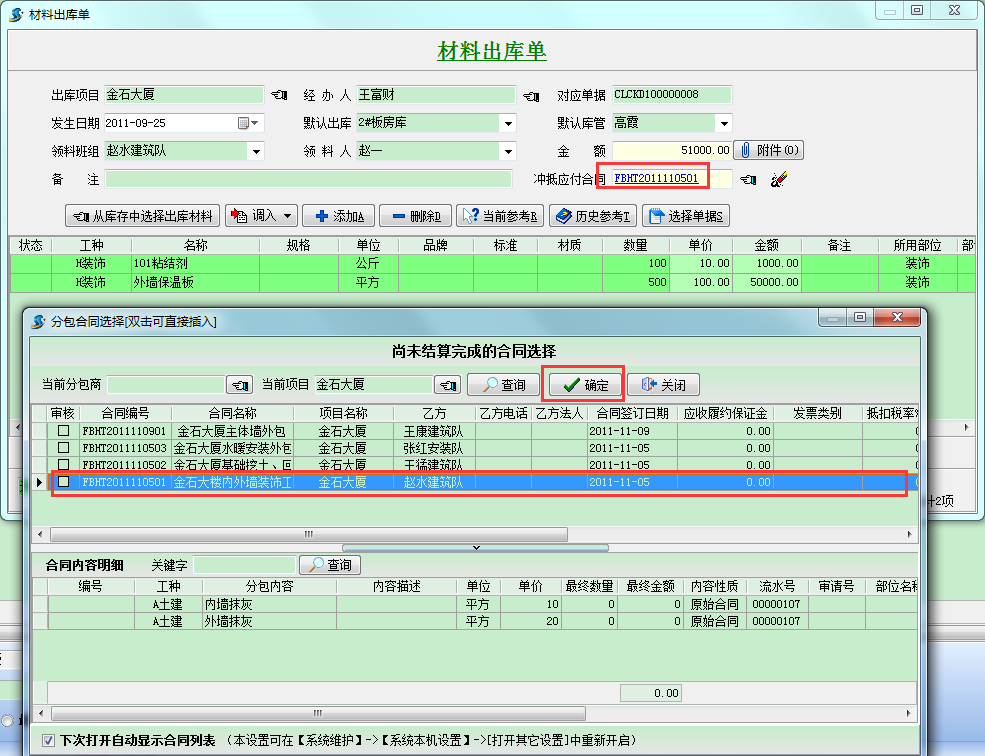 選定對(duì)應(yīng)合同后,點(diǎn)擊保存,這樣就可以實(shí)現(xiàn)分包工程款的沖抵。