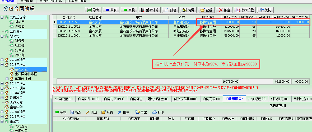 在工程項(xiàng)目管理中,工程款含甲供材費(fèi)用的情況經(jīng)常會(huì)遇到,若總包方對(duì)外分包而且分包款也是包含甲供材費(fèi)用的話,同樣的在分包管理中就應(yīng)該在分包工程款中扣除相應(yīng)的甲供材費(fèi)用。或者我方給分包商提供材料。為此金石工程項(xiàng)目管理軟件中做出相應(yīng)的解決方案,以下為示例說明