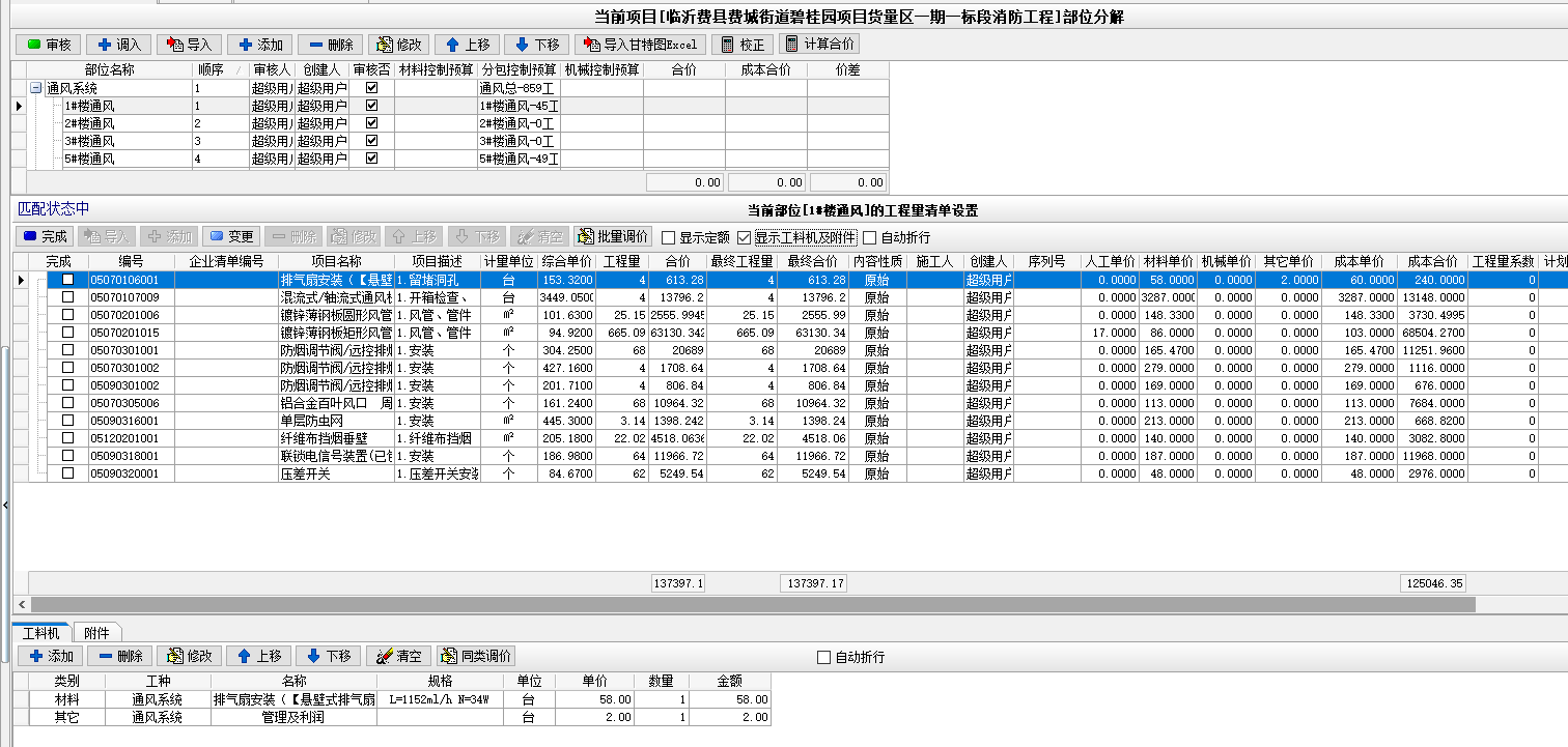 工程管理模塊下,【部位分解及工程量清單】中,部位部位分解中增加‘合價(jià)’、‘成本合價(jià)’和‘價(jià)差’三個(gè)字段,旨在體現(xiàn)出當(dāng)前部位下合同清單金額、成本清單金額(由企業(yè)清單中工料機(jī)計(jì)算得出)和兩者的差值形成的價(jià)差(實(shí)際就是利潤(rùn))。如下圖所示