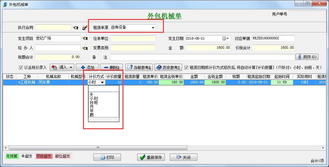 在工程項(xiàng)目管理軟件【租賃管理】-【外包機(jī)械單】中,選擇以自有設(shè)備外包,也可以實(shí)現(xiàn)計(jì)算設(shè)備成本,如下圖: