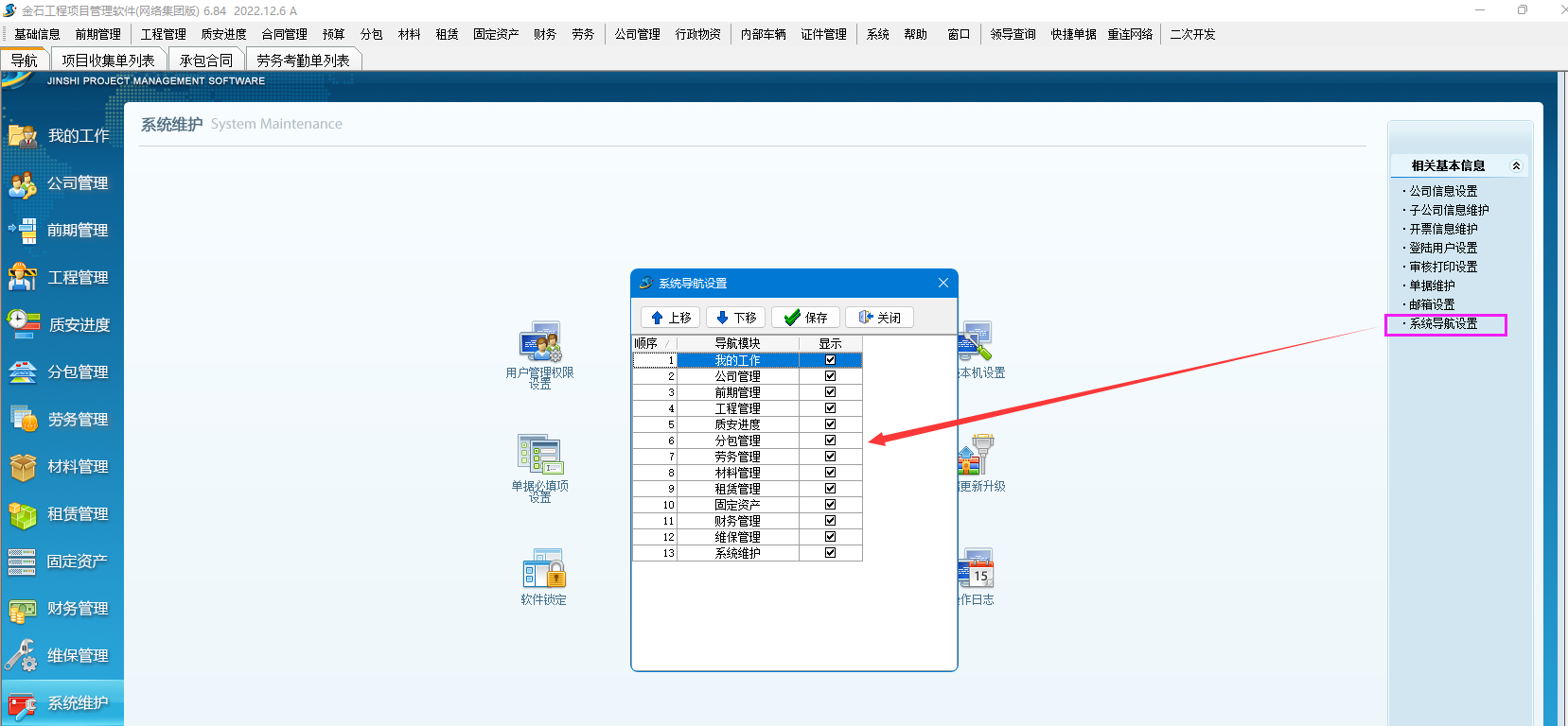 導(dǎo)航增加公司管理、前期管理、勞務(wù)管理、維保管理。導(dǎo)航界面可以調(diào)整顯示模塊。