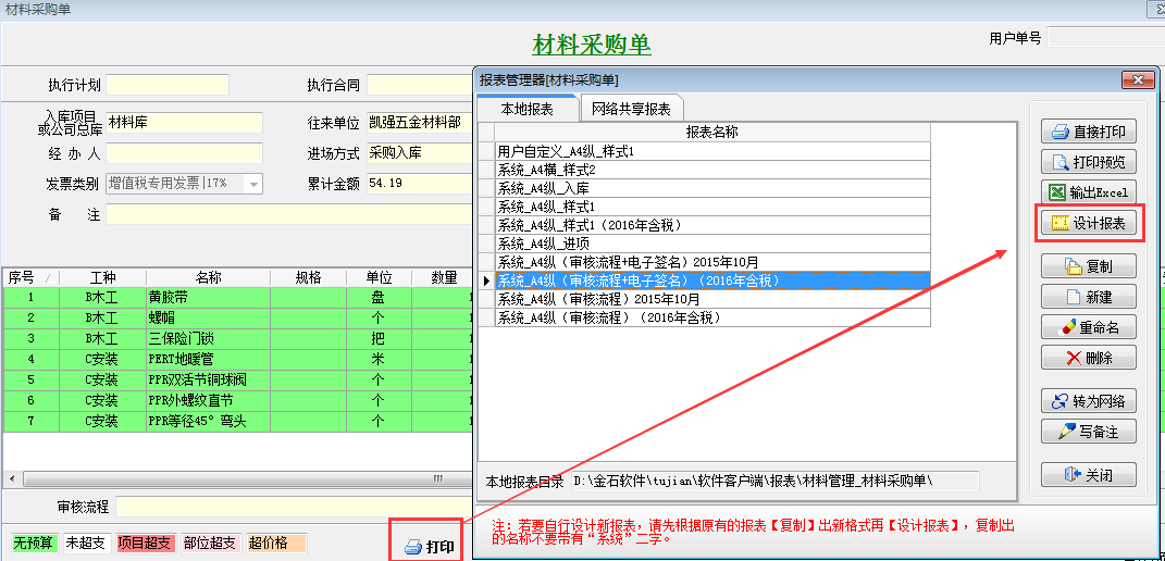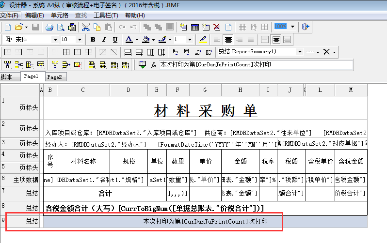 打印次數(shù)變量為:[CurDanJuPrintCount],在業(yè)務單據(jù)【打印】處,選中打印報表,點擊設計報表,在報表【總結(jié)】項中增加“本次打印為第[CurDanJuPrintCount]次打印。