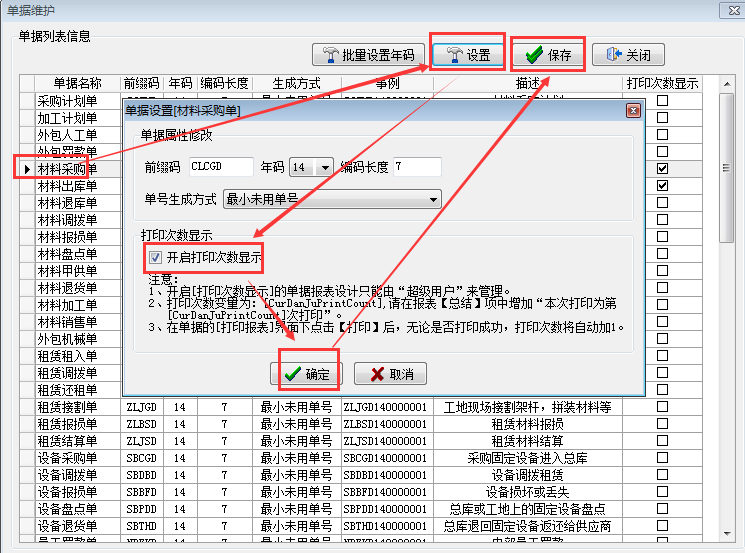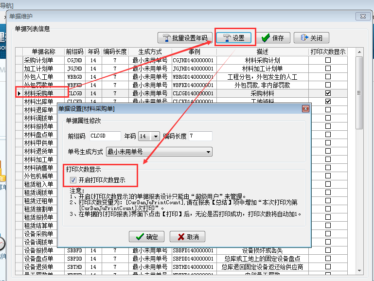 登錄超級用戶,在菜單欄【系統(tǒng)】-【單據(jù)維護】找到對應業(yè)務單據(jù),點擊設置按鈕在開啟打印次數(shù)顯示處打上對勾,然后點擊確定。如下圖: