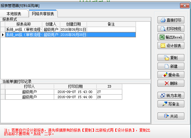 (1) 開啟【打印次數(shù)顯示】的單據(jù)報表設計只能由“超級用戶”來管理。(2) 在單據(jù)的【打印報表】界面下點擊【打印】后,無論是否打印成功,打印次數(shù)將自動加1。