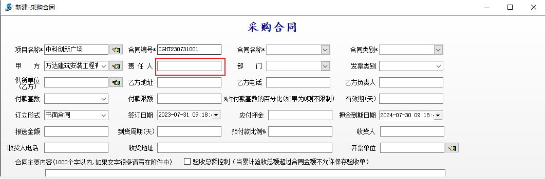 2、采購合同新建時(shí),責(zé)任人留空,不再帶入上次記錄內(nèi)容。