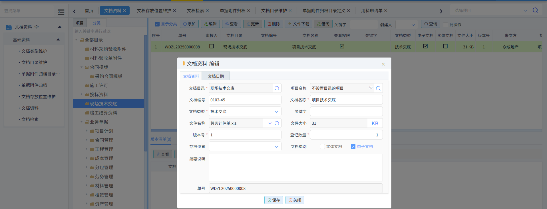 左側(cè)選擇目錄,點(diǎn)擊添加,輸入文檔名稱,選擇文檔類型,若是電子檔,勾選電子文檔,文件名稱處選擇文件上傳,輸入版本號等,如果是實(shí)體文檔,無需上傳文件,但需選擇存放位置,如下圖所示