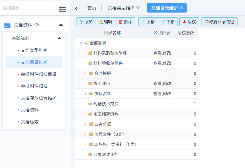 常見文檔資料的目錄需要提前維護(hù)好,以便后期資料上傳時(shí)選擇。如下圖
