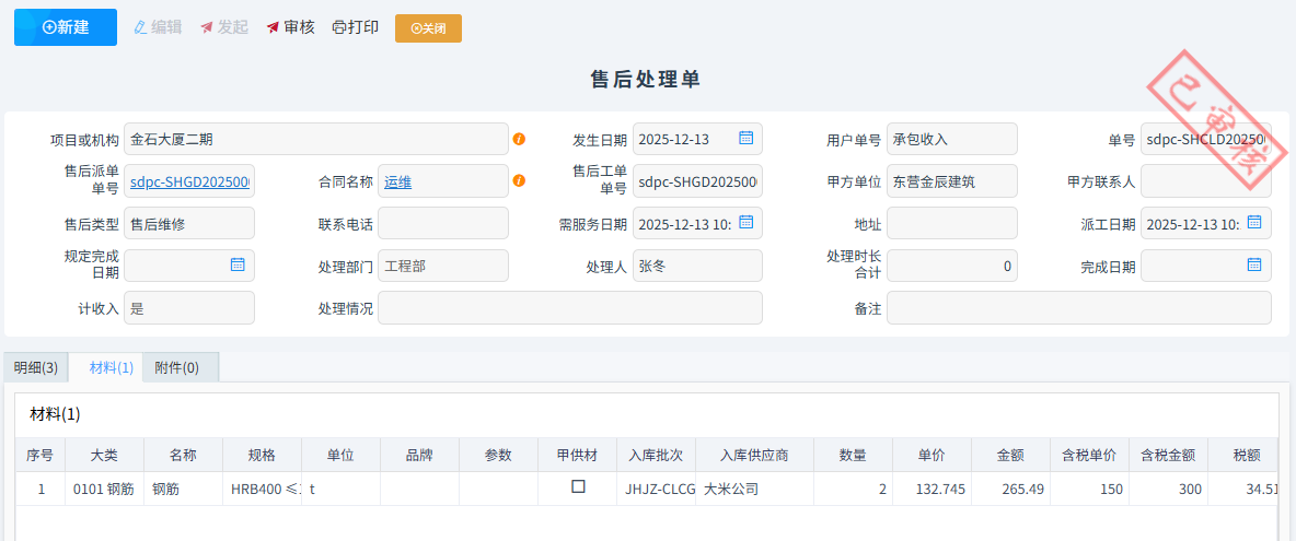 現(xiàn)場技術(shù)人員維修或者安裝完成之后填寫售后處理單。售后處理單可以關(guān)聯(lián)售后派單,自動生成需處理明細。