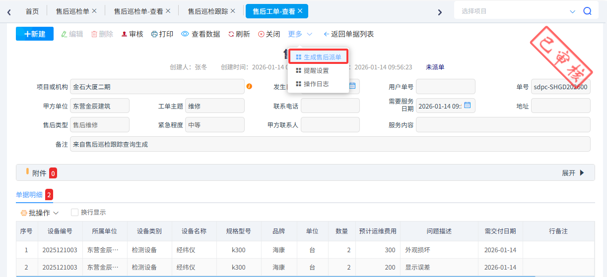 經(jīng)領(lǐng)導(dǎo)審核后,派單人員可以根據(jù)售后巡檢跟蹤生成售后工單