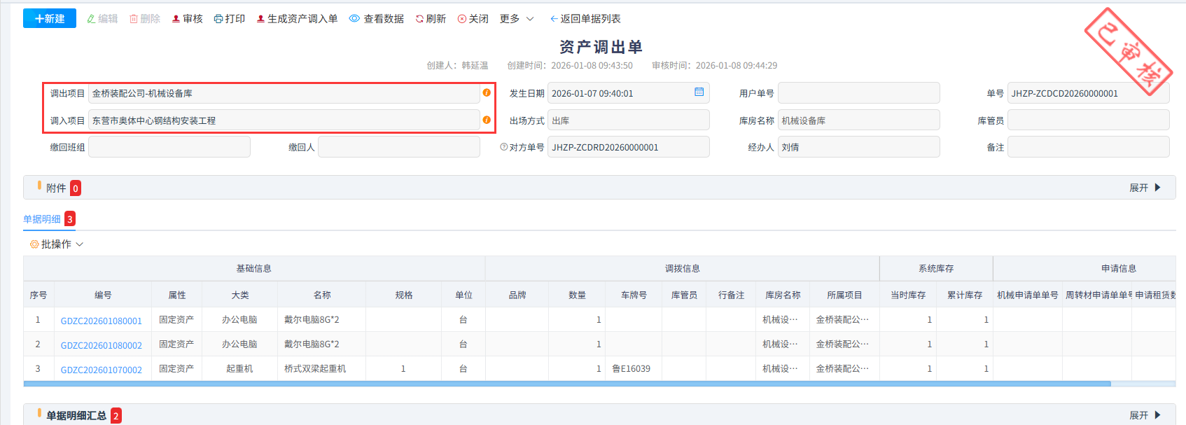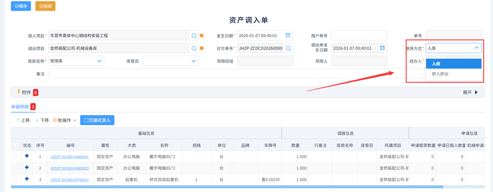 資產(chǎn)調入是指企業(yè)將資產(chǎn)從其他項目、部門或倉庫轉入特定使用地點的流程,資產(chǎn)調入單須通過已審核的資產(chǎn)調出單生成,生成過程中調入方可根據(jù)實際情況選擇入庫和即入即出(此選項不進入庫房,領用無需出庫)