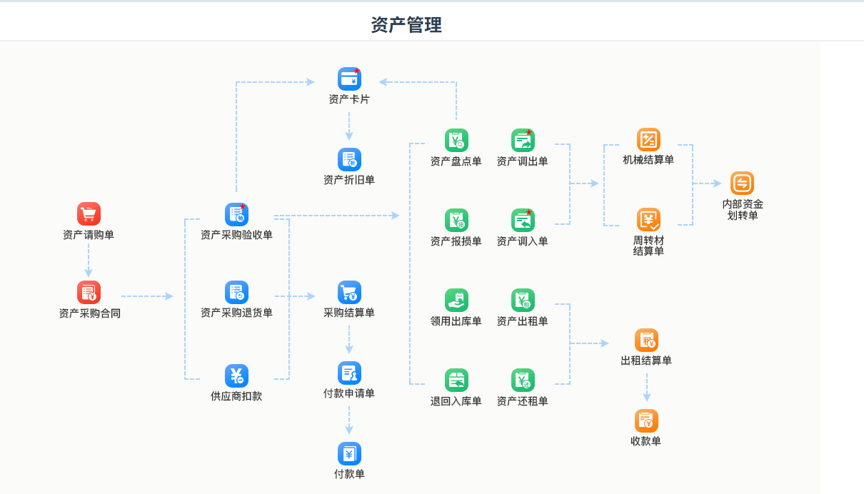 資產(chǎn)管理是公司的固定資產(chǎn)的管理,包括資產(chǎn)的采購、日常維修和保養(yǎng)、報損、折舊、項目調撥、在各項目的分布,針對公司內(nèi)部的使用成本核算,也可以用于對外出租產(chǎn)生收入(相關單據(jù):【資產(chǎn)出租單】,【資產(chǎn)還租單】,【資產(chǎn)出租結算單】