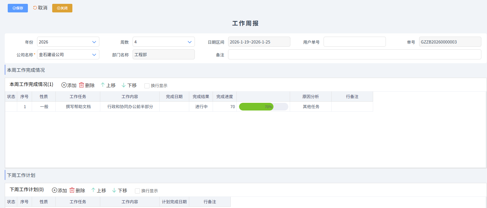 年份默認(rèn)為本年度,周數(shù)會(huì)顯示本年度所有周數(shù),如26年會(huì)顯示1~52周,公司名稱需要手動(dòng)選擇。注意上圖中的工作周報(bào)若本周的工作任務(wù)沒有完成,那么新的一周的工作周報(bào),可以直接調(diào)取未完成的歷史任務(wù)。如下圖所示: