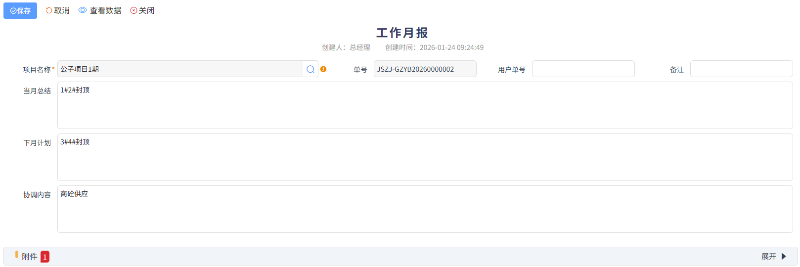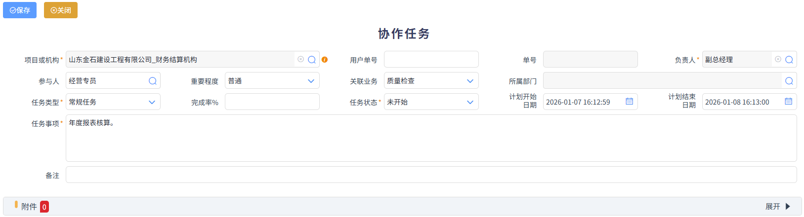 協(xié)作任務(wù)可以是領(lǐng)導(dǎo)下達(dá)任務(wù),需要負(fù)責(zé)或參與人完成,或者發(fā)起人任務(wù)切需要其他人來協(xié)作完成的單據(jù),如下圖所示,可以體現(xiàn)任務(wù)事項(xiàng)、負(fù)責(zé)人、參與人、關(guān)聯(lián)業(yè)務(wù)、任務(wù)狀態(tài)、計(jì)劃開始和結(jié)算日期等,