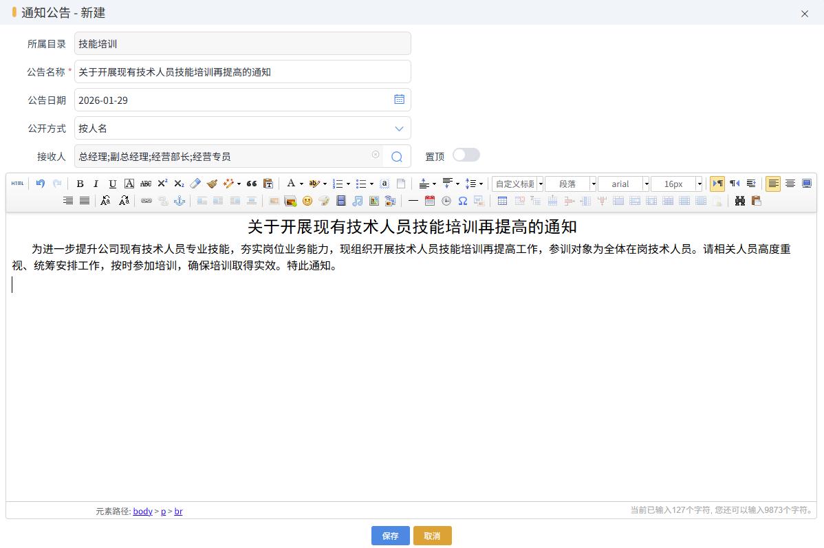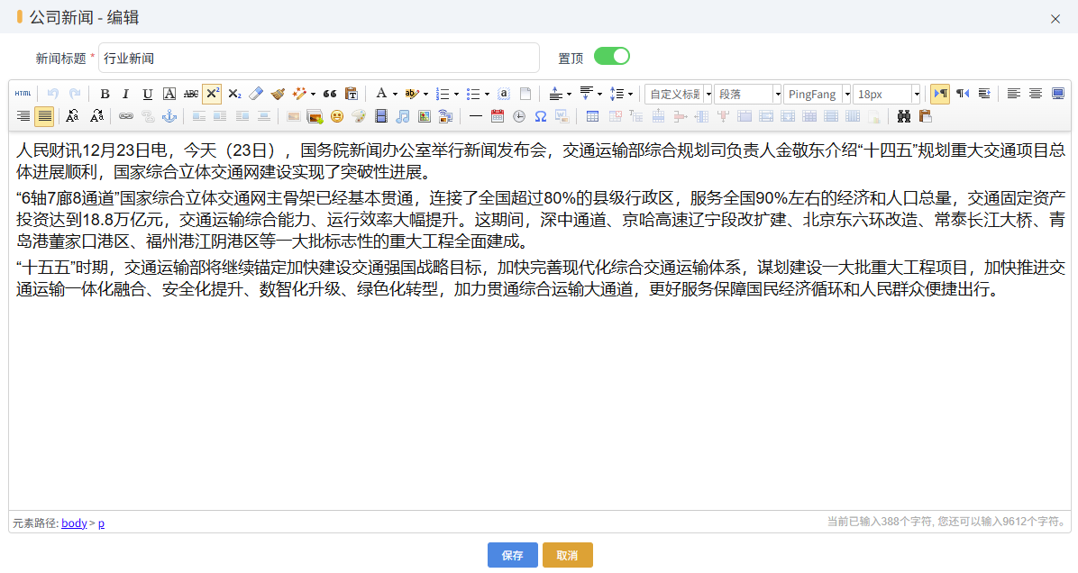 新建公司新聞,輸入新聞標(biāo)題,置頂與否,下方的是新聞內(nèi)容,根據(jù)需要調(diào)整段落格式,字體等,如下圖所示: