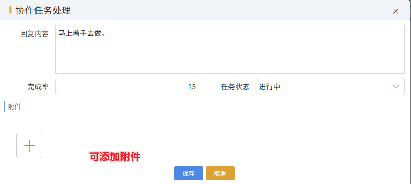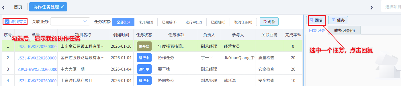 負(fù)責(zé)人或參與人可以在協(xié)作任務(wù)處理種對(duì)任務(wù)進(jìn)行回復(fù)和處理。