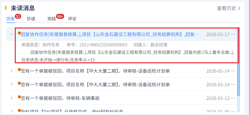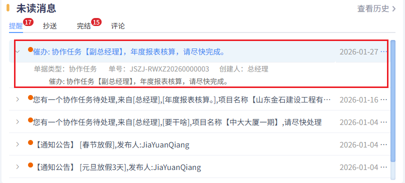 保存后,任務(wù)發(fā)起人會(huì)收到任務(wù)完成的消息提醒。如下圖所示: