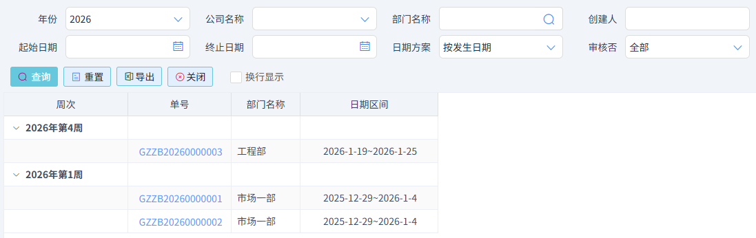 工作周報(bào)一覽可根據(jù)年份、公司名稱、部門名稱、創(chuàng)建人和日期查詢對(duì)應(yīng)周報(bào),如下圖所示: