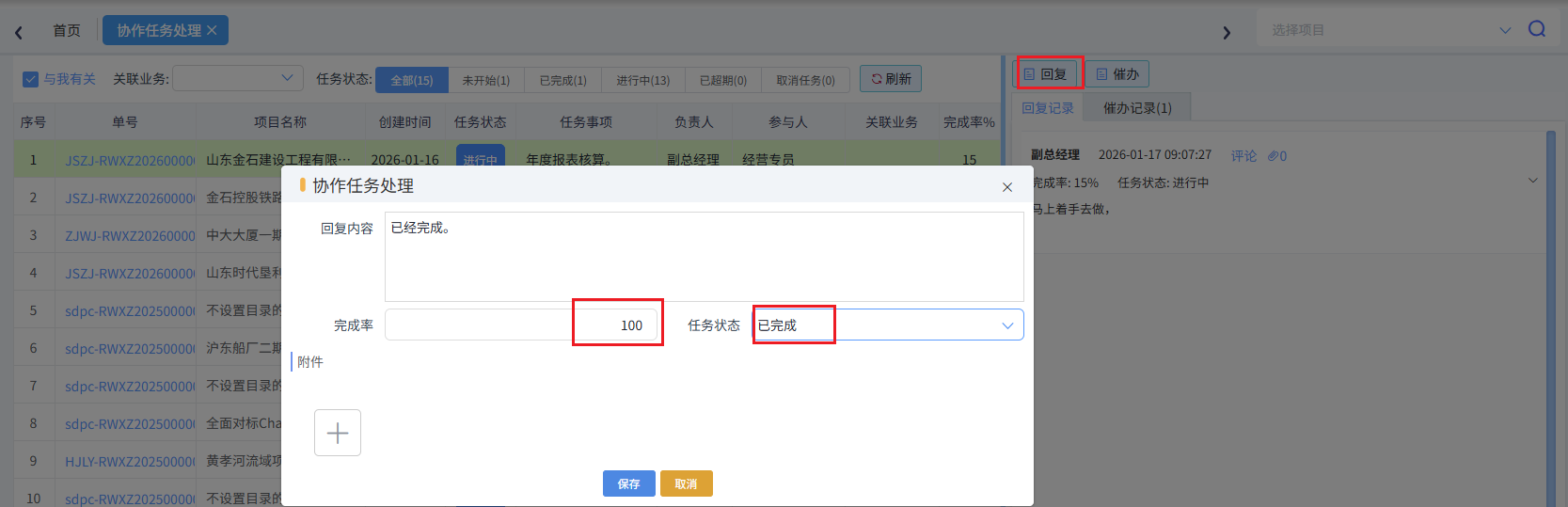 在彈出的任務(wù)處理界面,輸入完成率(當(dāng)前任務(wù)的進(jìn)度)、回復(fù)消息并更新任務(wù)狀態(tài),如下圖所示:
