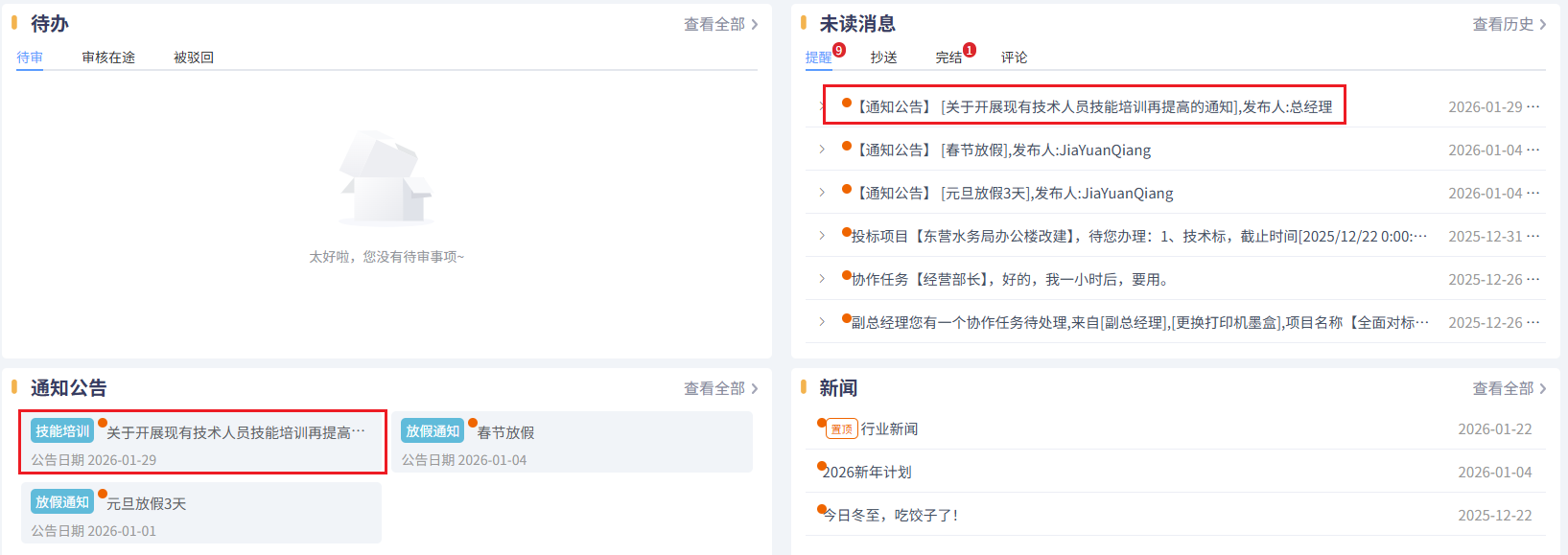接收人在首頁的通知公告欄和未讀消息中看到此通知,如下圖所示:
