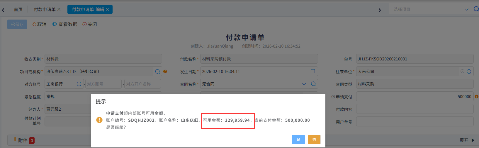 【付款申請(qǐng)單】超項(xiàng)目資金余額、內(nèi)部賬戶金額預(yù)警提示,避免超項(xiàng)目的資金賬戶余額不足時(shí),仍提交付款申請(qǐng)并完成支付,防止出現(xiàn)資金透支、違規(guī)墊付等問(wèn)題,保障資金安全。