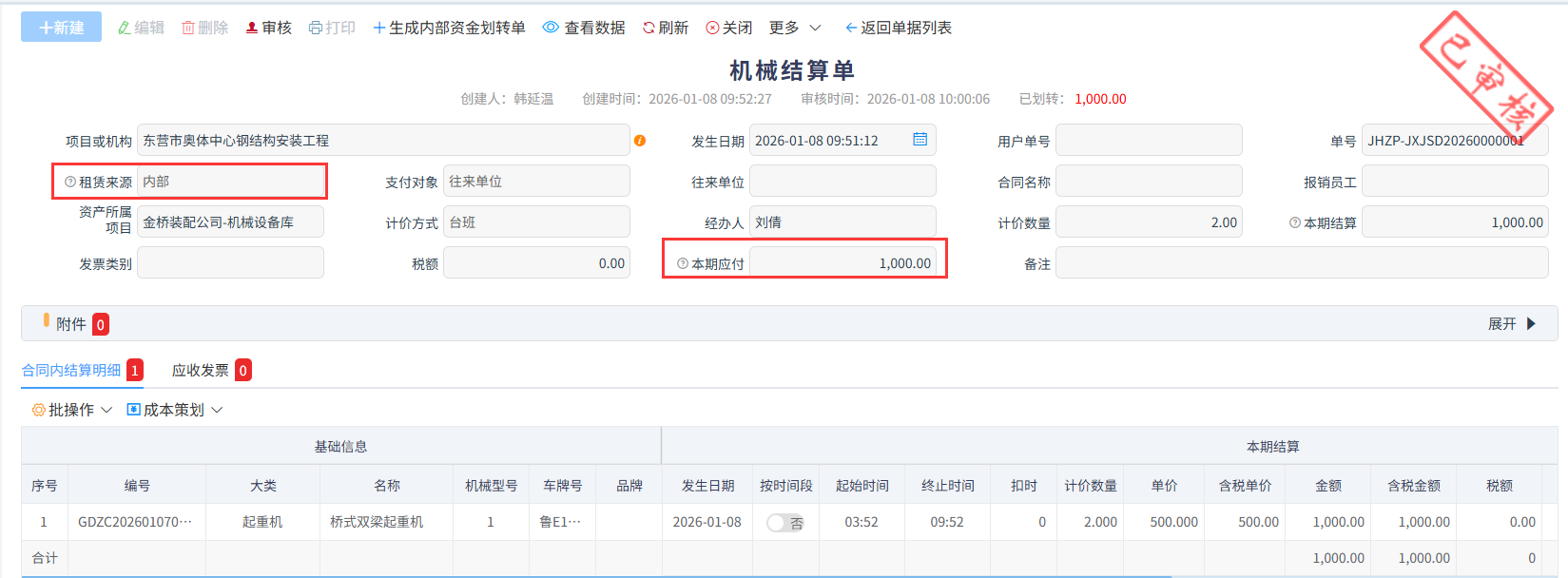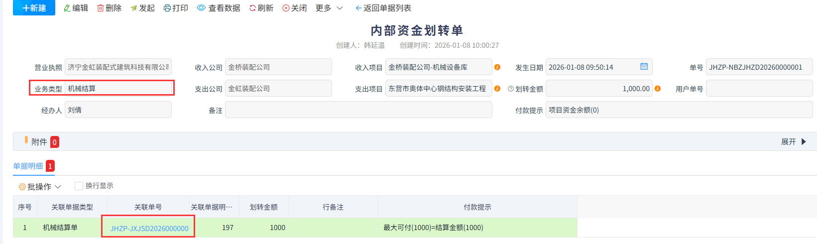 如:針對(duì)上圖的機(jī)械結(jié)算單進(jìn)行資金劃轉(zhuǎn)