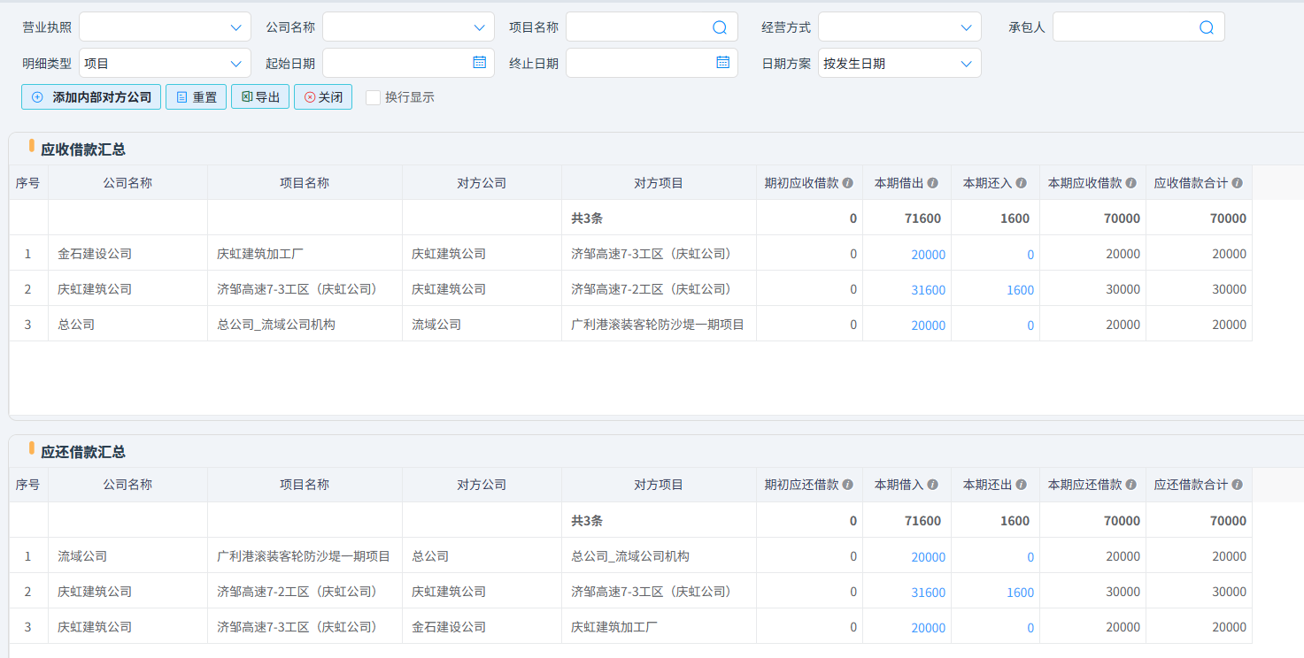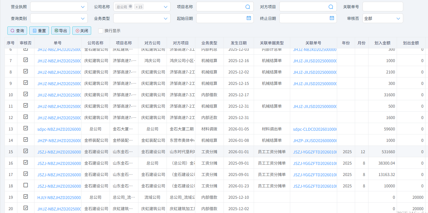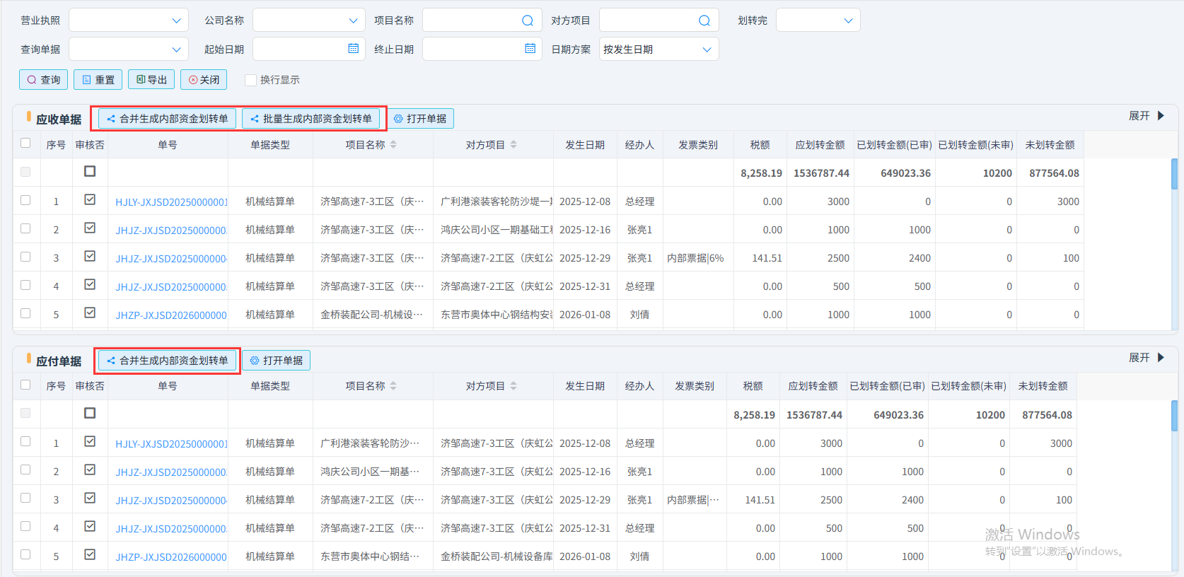 大部分內(nèi)部業(yè)務(wù)是先有內(nèi)部結(jié)算(如【機(jī)械結(jié)算單】、【周轉(zhuǎn)材結(jié)算單】、【費(fèi)用分?jǐn)偂?、【材料調(diào)撥】、【工資分?jǐn)偂?、【?xiàng)目補(bǔ)繳稅金】、【內(nèi)部借款】、【內(nèi)部還款】、【內(nèi)部利息】)再以內(nèi)部結(jié)算進(jìn)行企業(yè)內(nèi)部資金劃轉(zhuǎn),每筆結(jié)算和劃轉(zhuǎn)必須是相同一個(gè)“營(yíng)業(yè)執(zhí)照”內(nèi)不同機(jī)構(gòu)或項(xiàng)目之間的內(nèi)部往來(lái),可規(guī)范內(nèi)部資金流轉(zhuǎn),確保資金調(diào)撥有跡可循、審批合規(guī)便于財(cái)務(wù)部門統(tǒng)一核算、對(duì)賬和資金管控。