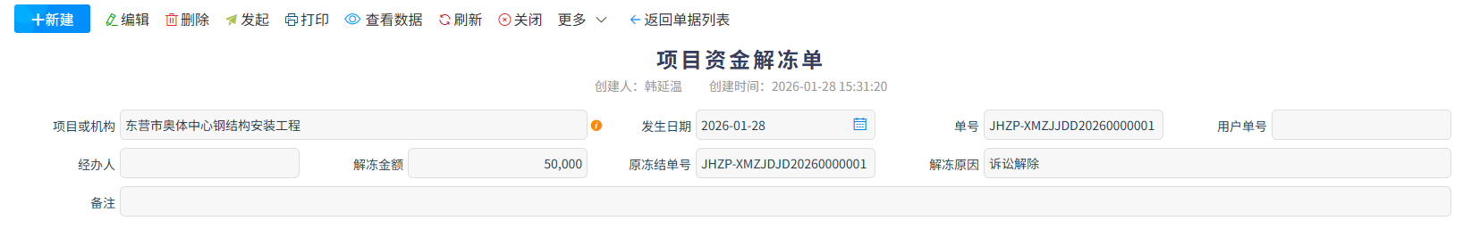 項(xiàng)目資金解凍單是配套【項(xiàng)目資金凍結(jié)單】的風(fēng)控單據(jù),用于對(duì)已凍結(jié)的項(xiàng)目資金發(fā)起解凍申請(qǐng)、完成審批流程并留存正式記錄,核心是按規(guī)解除資金的支取與流轉(zhuǎn)限制,讓凍結(jié)資金恢復(fù)正常使用狀態(tài)。