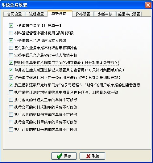 (2)材料采購單、材料銷售單、材料退貨單、外包人工單、外包機(jī)械單、運(yùn)輸車輛單、租賃結(jié)算單、其它費(fèi)用單、設(shè)備采購單、設(shè)備維修單、設(shè)備退貨單、付款申請單、付款單、收款單 (涉及財(cái)務(wù)的這14個單據(jù)) 對于【財(cái)務(wù)部】也不受該條件限制,可以查看所有部門單據(jù)。