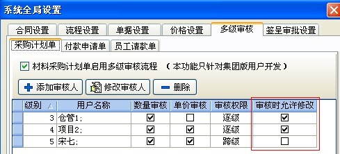 (1) 在采購計(jì)劃單、付款申請單、員工請款單中的多級審核設(shè)置中,如下圖: