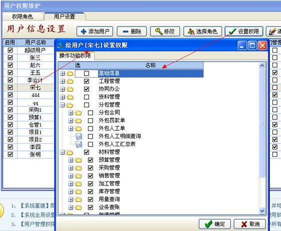 (5)設(shè)置好用戶的部門,規(guī)屬公司,最后還有重要的一步操作就是給用戶進(jìn)行菜單功能授權(quán)。如下圖: