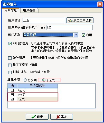 如上圖:王五規(guī)屬于B、C公司,是【公司經(jīng)理】可以看到B、C兩個公司的所有部門、所有授權(quán)項(xiàng)目有關(guān)的業(yè)務(wù)單據(jù)。