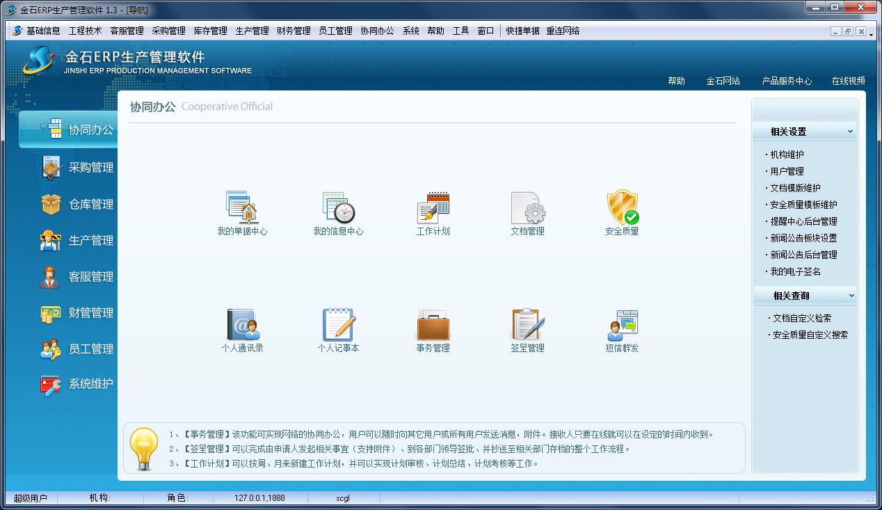 協(xié)同辦公主要管理文檔資料存檔、新聞公告、簽呈、信息中心、單據(jù)中心、工作計劃等業(yè)務(wù),可以作為OA管理軟件使用。