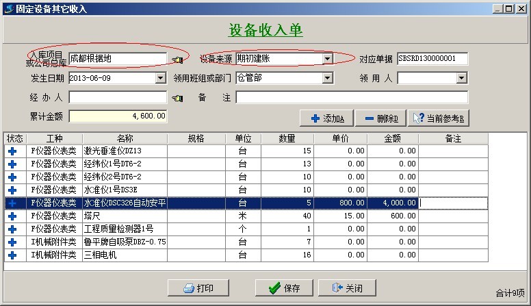 固定設(shè)備、材料庫存的實(shí)際數(shù)量應(yīng)該通過業(yè)務(wù)單據(jù)來錄入。其中固定設(shè)備通過設(shè)備收入單來錄入期初數(shù)量。如下圖: