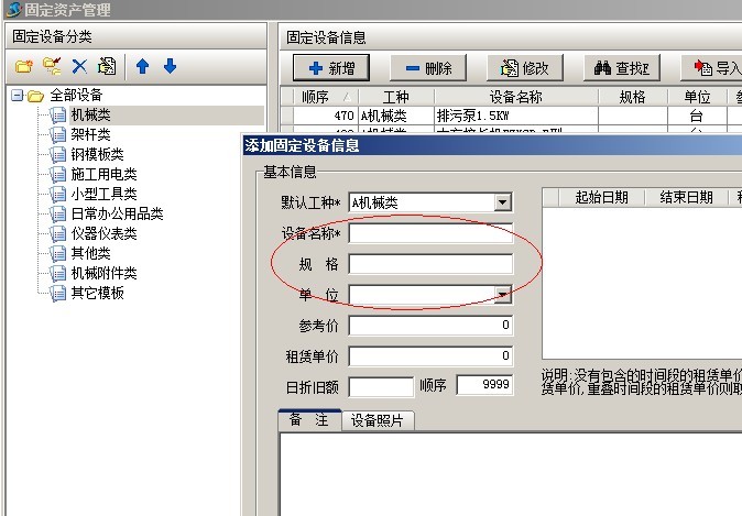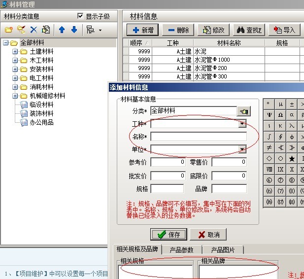 首先注意的是,不要把固定設(shè)備期初統(tǒng)計(jì)、材料庫存統(tǒng)計(jì)與基礎(chǔ)信息中設(shè)備維護(hù)、材料維護(hù)混淆。其中設(shè)備維護(hù)和材料維護(hù)記錄的是設(shè)備、材料的名稱、規(guī)格、品牌、所屬工種、分類等基本信息。如下圖: