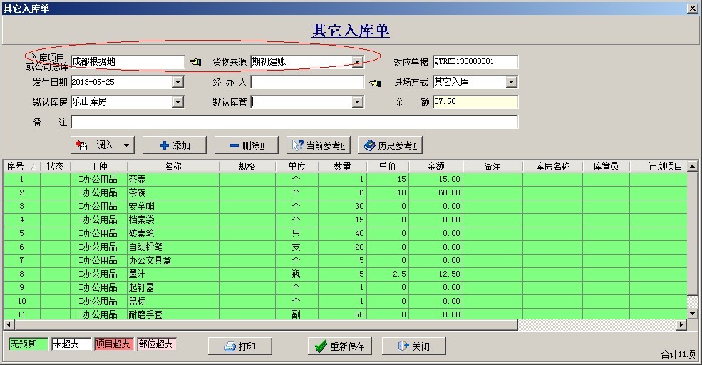 材料庫存通過其他入庫單來錄入庫存數(shù)量。如下圖: