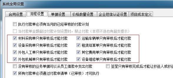 公司規(guī)定:只有審核后的單據(jù)才能提起付款申請(qǐng),所以超級(jí)用戶已經(jīng)在【全局設(shè)置】中開啟了以下八個(gè)開關(guān):
