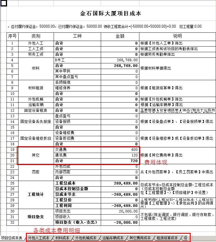 彈出項(xiàng)目成本利潤(rùn)表,可以查看該項(xiàng)目的其他費(fèi)用項(xiàng)目,是否有顯示之前錄入的費(fèi)用。其他的類別隨著工程的進(jìn)度中,錄入相應(yīng)的單據(jù),會(huì)產(chǎn)生其對(duì)應(yīng)的成本費(fèi)用。