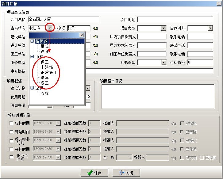 (1)需要再回到【項(xiàng)目開(kāi)拓】中修改項(xiàng)目開(kāi)拓的狀態(tài)為中標(biāo)的狀態(tài)(中標(biāo)下的五個(gè)狀態(tài)任選一項(xiàng)),然后保存