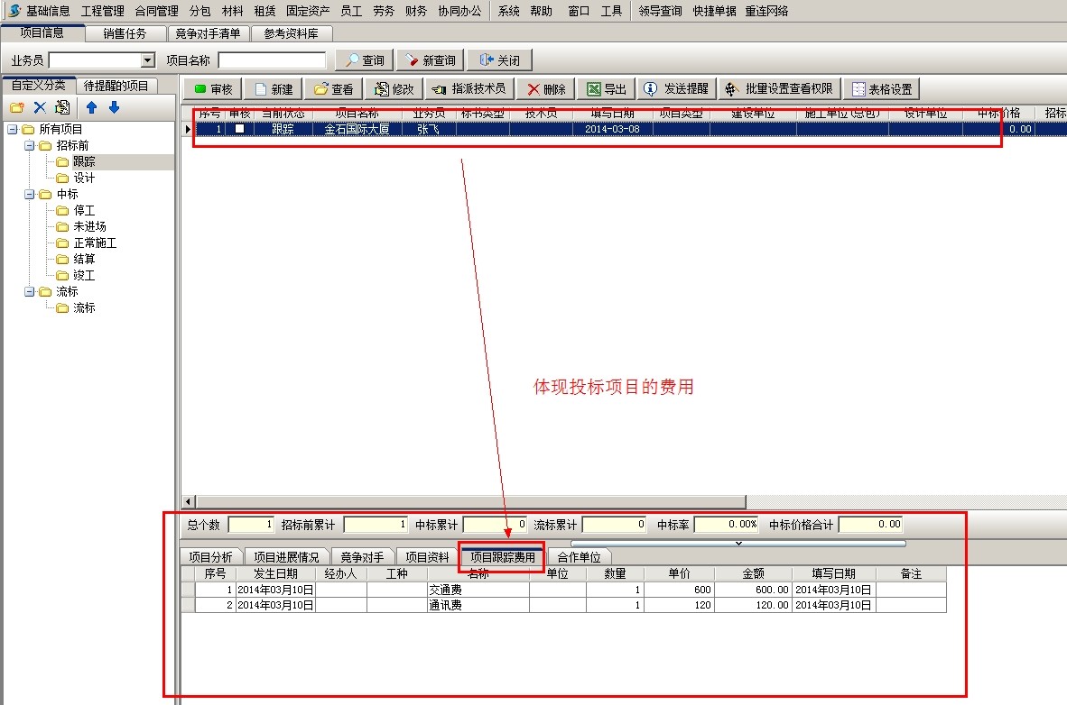 以公司的“市場(chǎng)部”或“銷售部”來(lái)進(jìn)行前期費(fèi)用的承擔(dān)。如果項(xiàng)目沒(méi)有中標(biāo),則前期跟蹤費(fèi)用自然歸屬到該部門下,如果中標(biāo)通過(guò)在【項(xiàng)目維護(hù)】中新建項(xiàng)目,從項(xiàng)目開(kāi)拓中引入,并確認(rèn)結(jié)轉(zhuǎn)費(fèi)用即可。