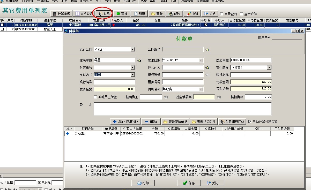 選中單據(jù)點(diǎn)擊付款,選擇支付方式,點(diǎn)保存。項(xiàng)目開(kāi)拓中可以查看到該投標(biāo)項(xiàng)目發(fā)生的費(fèi)用