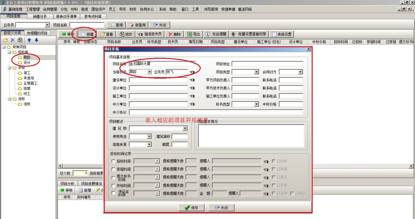 1、項(xiàng)目立項(xiàng)后,首先到【項(xiàng)目開(kāi)拓】新建項(xiàng)目,注意選擇項(xiàng)目相應(yīng)的狀態(tài)(必須為招標(biāo)前),然后錄入項(xiàng)目的基本信息,如下圖: